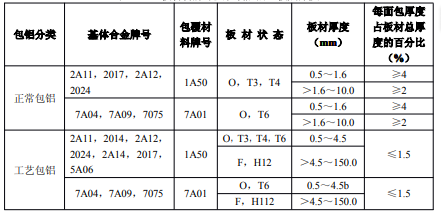 ②厚度小于等于0.7mm經(jīng)鹽浴爐生產(chǎn)的退火板材,只能供應(yīng)寬度小于或等于1200mm,長(zhǎng)度小于或等于4000mm的板材。包覆層需包鋁的板材應(yīng)進(jìn)行雙面包覆,其包覆材料牌號(hào)及軋制后的包覆層厚度應(yīng)符合表3的規(guī)定。